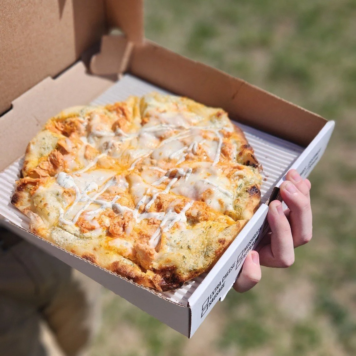Chicken, Buffalo Hot Sauce, House Ranch, Mozzarella Cheese and Drizzle of House Ranch Post Bake
